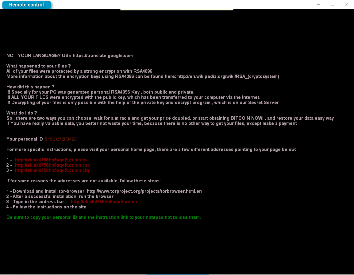 La nota de rescate notifica al usuario de que sus archivos fueron cifrados con un algoritmo potente RSA-2048, le asigna una identificaci�n y le insta a enviar un correo electr�nico a una de dos direcciones de correo electr�nico para que pueda recuperar sus archivos.